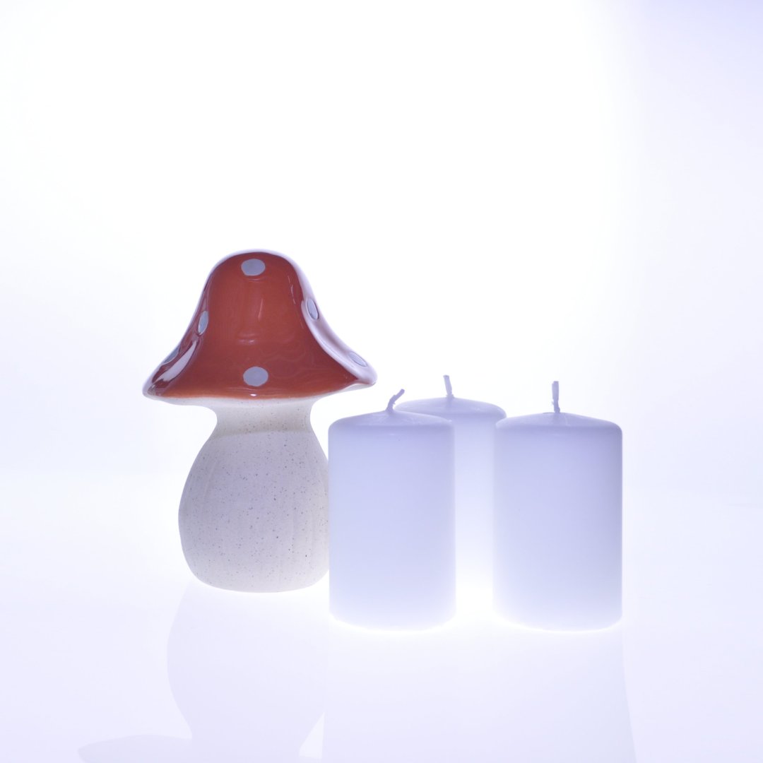 Zestaw trzech klasycznych świec w eleganckim, białym kolorze to ponadczasowy dodatek do każdego wnętrza. Ich gładka, jednolita struktura i prosta forma sprawiają, że wkomponują się zarówno w nowoczesne, jak i klasyczne aranżacje. Całość uzupełnia dekoracyjny akcent – ceramiczna figurka grzybka, która dodaje lekkości i charakteru całemu zestawowi.