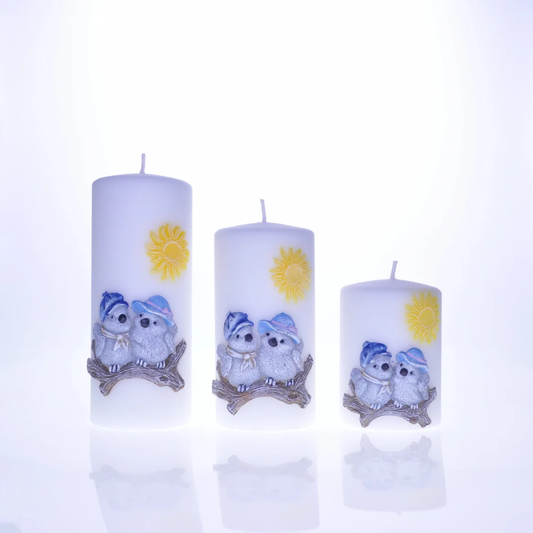Każda świeca ma subtelną, elegancką powierzchnię, a trójwymiarowy wzór z detalami w odcieniach żółci, niebieskiego i pastelowego różu doskonale dopełnia wystrój klasyczny, skandynawski czy romantyczny. Różne wysokości (17 cm, 14 cm i 10 cm) pozwalają na swobodne komponowanie zestawu w przestrzeni – od parapetu po komodę czy stolik kawowy.