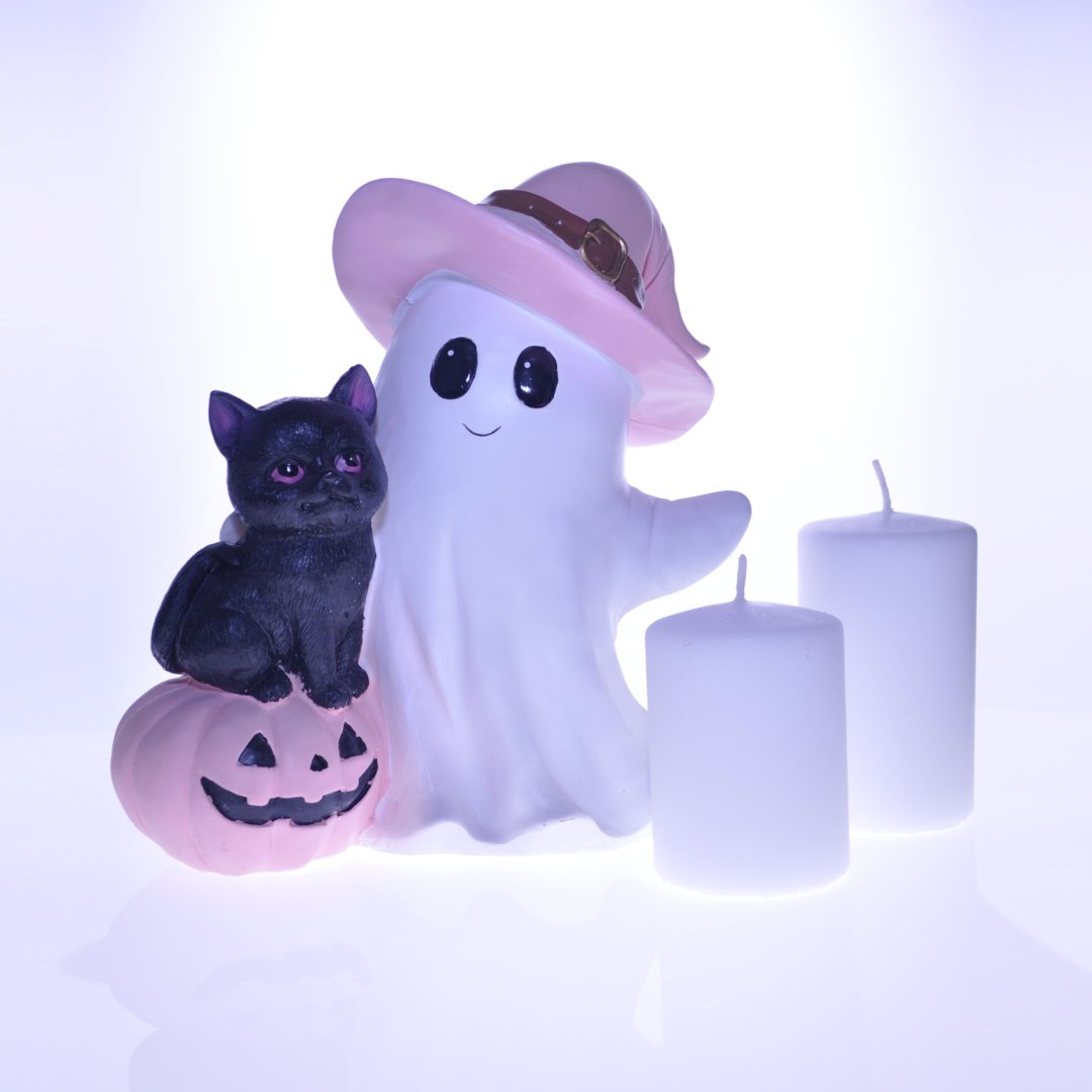 Ten unikalny zestaw łączy w sobie element figlarny i elegancki. Centralnym punktem jest duży, ceramiczny duch w pastelowym kapeluszu – dekoracja, która nie tylko przyciąga wzrok, ale i wnosi do wnętrza niepowtarzalny klimat. Obok niego znajduje się uroczy czarny kot siedzący na matowej, różowej dyni oraz dwie klasyczne, białe świece o gładkiej strukturze.